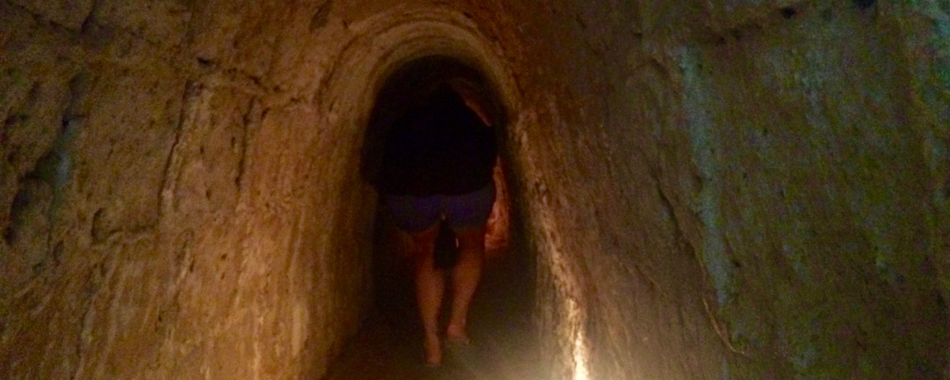 Die zeitintensivere Anreise hatte sich gelohnt: Nach einem etwas einseitigen Infofilm stand uns ein unterhaltsamer Guide zur Seite, der im Eintrittspreis von nicht einmal vier Euro inkludiert ist. Er erzählte uns in gutem Englisch allerlei Wissenswertes über das ausgeklügelte Tunnelsystem der Vietcong: Die ersten Tunnel sind in den 1940er Jahren entstanden und wurden bereits im Krieg gegen die Franzosen genutzt. In den Sechzigern wurde das Netz immer weiter auf eine unglaubliche Länge von 250 km und aufgrund der amerikanischen Bombardierungen immer tiefer (bis zu 12 m) auf drei Ebenen ausgebaut. So entstand unter der Erde eine komplexe Versorgungsinfrastruktur aus Lazaretten, Büros, Küchen und Schlafgelegenheiten. Alle unterirdischen Räume waren mit Tunneln von maximal 80 cm Höhe und 60 cm Breite verbunden. Während sich diejenige von uns, die mit Blick auf die Körpergröße noch etwas mehr vietnamesischem Maß entspricht, darauf beschränkte, durch die für Touristen verbreiteten Gänge (1,20 m Höhe und 0,80 m Breite) zu laufen, zwängte sich Steffen durch die originale Öffnung (0,35 m x 0,25 m) sowie ein paar Meter ursprünglichen Tunnel.