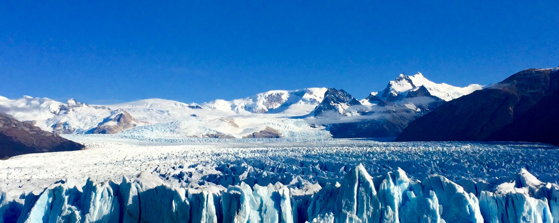 Doch das wahre Ausmaß seiner mächtigen Schönheit entfaltet sich aus der Nähe. Der Betrachter blickt auf ein Meer aus weißen Zacken, das sich die Hänge hinauf zieht. Die Sonne, unter der wir Glückspilze dieses Naturwunder bestaunen dürfen, perfektioniert das Spektakel: Der Gletscher erstrahlt an seiner bis zu mehr als 70 Meter hohen Abbruchkante, in seinen Spalten und Verwerfungen in der ganzen Palette schönster Eisbonbon-Tönen bis hin zu einem dunklen, unglaublich leuchtenden Blau. Der See, als möchte er konkurrieren, ergänzt einen Mix aus kräftigem Mint, Türkis und Petrol.